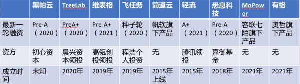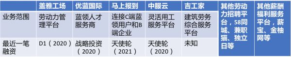乐观的前景吸引了资本的青睐。自2020年,维表格、treelab、黑帕云等通过无代码进行流程/系统搭建的工具相继获得融资; 蓝领人才服务商优蓝国际、蓝领用工平台马上报到、劳动力管理服务商盖雅工场、灵活用工服务平台中服云等围绕蓝领用工的企业也相继在同年获得融资。