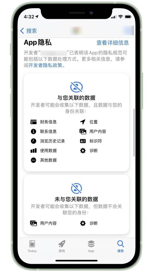 如果你将手机更新到了最新的 iOS 系统,就可以在 App Store 里看到 app 会获取你的哪些信息,而这些信息又是否会与你的身份关联。ATT 要求必须获得用户的许可才能收集信息。