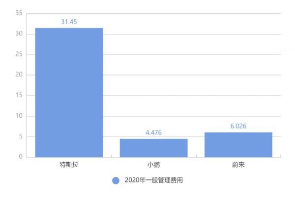 2020年,特斯拉全年一般管理费用为31.45亿美元,小鹏汽车为4.476亿美元,蔚来汽车为6.026亿美元。与之相比,特斯拉全年研发费用为14.91亿美元,小鹏汽车为2.64亿美元,蔚来汽车为3.81亿美元。可见,研发并不是新能源汽车的重头。