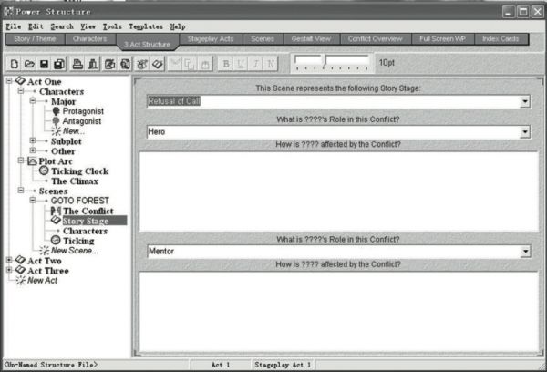 但两个软件对于编剧的大纲构思只能起到辅助的作用,Power Structure主页面由两部分组成,左边是剧本大纲的树形图,中间是对剧本结构创作过程中的不同要素提出问题。