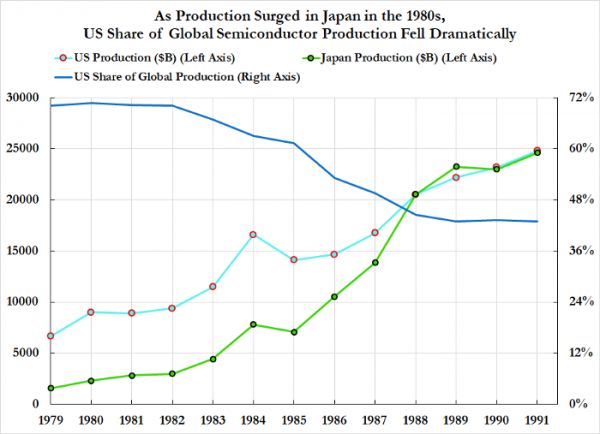 日本采取了美国同一种类型的政策,用来迅速打造能力并主导全球市场:宏观指导,购买协议,廉价融资。但是,日本奉行的战略略有不同,他们的关注重点是为了出口市场而打磨更好理解的技术的生产,而不是光靠军事实施。一旦DRAM变成标准,并且成为半导体行业最大的单一市场之一,日本很快就占据了主导地位。