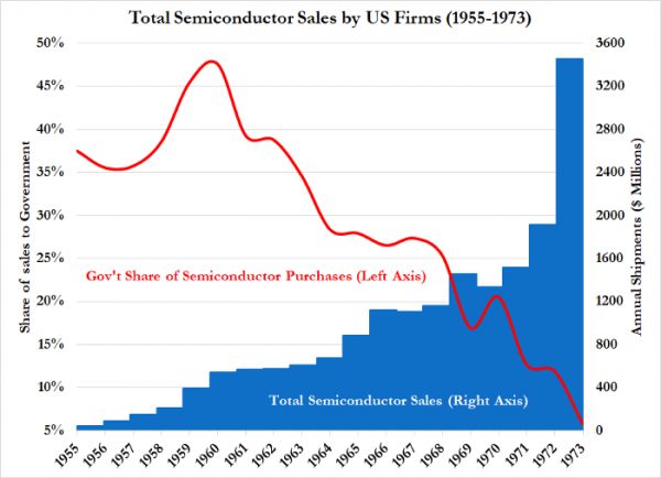 但是,到了1960年代末的时候,这个行业的发展实在是太快了,以至于政府采购(政府通过第二来源合同等手段行使准监管的能力也因此)都变得相对不重要了。半导体行业的存在是建立在1940年代后期军事采购的基础之上而来的,但到了1960年代后期,军事采购的占比已不到市场的四分之一。