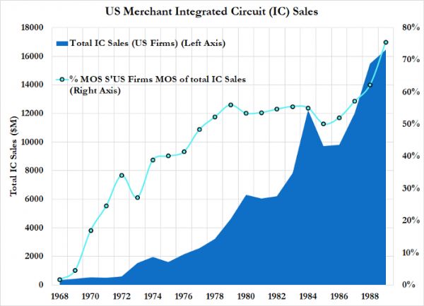 相反,大公司则把小公司仅剩的一些产能统统吸纳进去,并创建了大型的企业集团。随着公司开始采用类似的设计原则,MOS晶体管涌现成为了该行业的主导设计,这也使得专注于制造的“代工厂”具备了经济性。随后出现的垂直非一体化,导致出现了大型、垂直整合的企业集团与以设计为重点但不生产芯片的小型“无晶圆厂”公司共存的局面。从理论上来讲,这为这些“无晶圆厂”公司保留了追求创新设计策略的灵活性,同时又可以把间接成本降至最低。美国产业界对这一战略的拥护导致1990年代市场份额出现复苏,形成美国公司率先推出新的产品类别,而日本公司则面临新加入的韩国的竞争这样一种局面。
