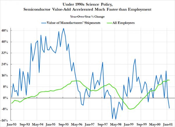 过去几十年的产业政策促进了大规模就业(这是创新的核心驱动力),而1990年代的“科学政策”则是出于效率简约化的考虑而避免采用这种做法。工人经常换公司,边做边学是创新的主要途径。实际上,经济地理学里面关于“非贸易的相互依赖”的研究在一定程度上得到了发展,部分就是为了解释大批半导体行业工人的混合对行业快速创新的重要性。在一个新的竞争环境下,尽管把大量工人集中在一个地方是众多进展的关键,但在这种新的竞争环境下,这被认为是一种浪费。劳动力是单位成本的重要组成部分,企业相信,如果自己能够从战略上缩小规模,就可以恢复全球竞争力。
