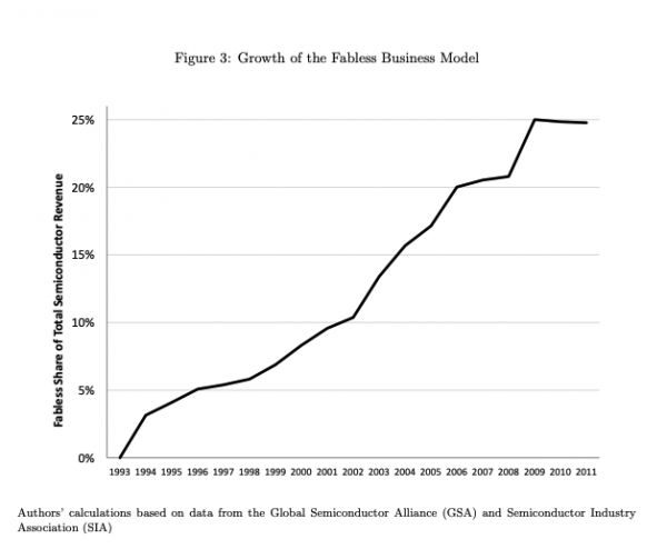 从研发到生产的过程中,也开始出现奇怪的不一致和反馈回环。科学政策战略的关键是把知识产权创新与生产过程创新进行分析上和经济上的分离。用外行的话来说,政策侧重的是研究、设计与想法,而不是实施、生产与投资。利用了国外制造厂的流程改进的“无晶圆厂公司”的兴起正是这一战略的直接结果。