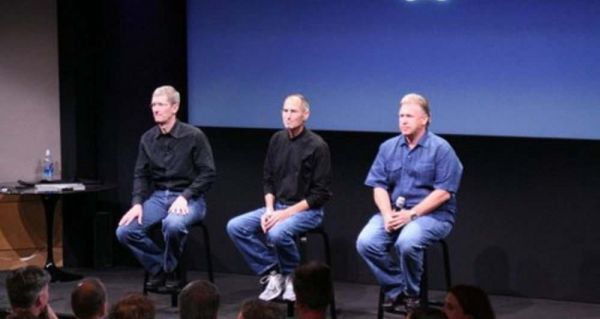 从左到右分别是库克、乔布斯以及菲尔·席勒