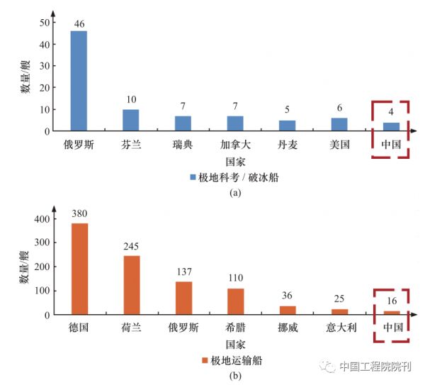 图2 主要国家的极地科考/破冰船与极地运输船数量情况(截至2017年)