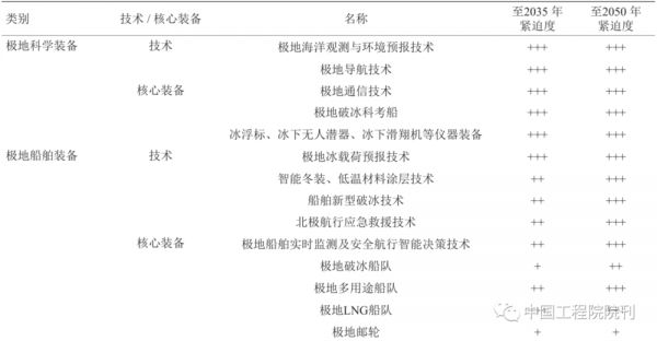 上述技术的突破,将有效促进我国极地装备的发展,为保护我国在北极地区的利益提供有力保障。表2总结了我国极地核心装备与技术面向2035年和2050年的需求紧迫度情况,可为后续极地装备重点发展方向深化论证提供支撑。