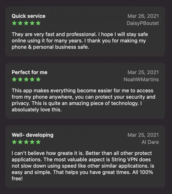 5 星评价 3:“我简直不敢相信这有多棒,它比其他保护应用都要好。最好的是 String VPN 不会像其他类似应用程序那样减慢速度。is easy and simple。这会让你度过美好时光,并且 100% 免费!”