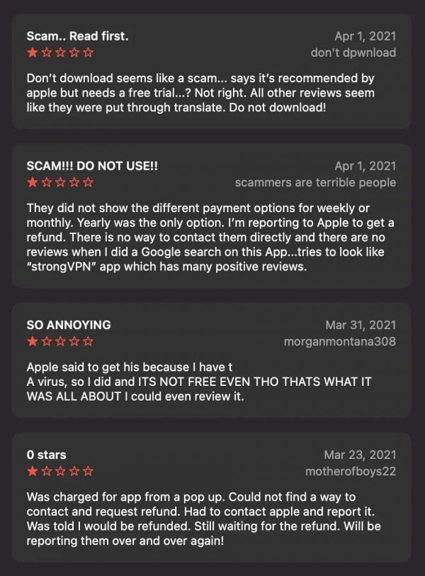 从评论可以看出,许多受骗者都由于是在 Safari 中收到弹出窗口,推荐他们下载该应用。此外这款 App 看起来还很像靠谱的“strongVPN ”应用,所以即使它没有按周或月,只有按年度 89.99 美元的订阅标准,还是有许多用户一时不查,被骗取了高昂的“订阅费”。