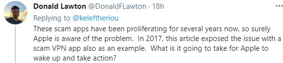网友@DonaldFLawton:这些诈骗应用已经泛滥了好几年了,苹果肯定意识到了这个问题。但怎样才能让苹果醒悟并采取行动呢?