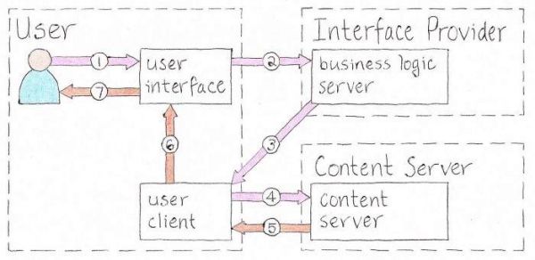 图3简单演示了如何通过当前的中心化平台将内容交付给用户。用户通过用户界面发出请求,用户界面将请求传递到业务逻辑服务器(步骤1和2)。该服务器确定需要什么内容,然后从内容服务器获取它(步骤3和4)。然后准备好要显示的内容,并发送到用户界面,用户界面将其显示给用户(步骤5和6)。业务逻辑和内容服务器由平台控制,并在平台的计算机上运行,而用户界面(例如浏览器或应用程序)在用户的计算机上运行。