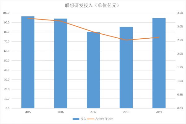 但联想在研发上的吝啬已经让联想错失了转机。据wind数据显示,联想集团2015-2019年,研发费用分别为96.36亿元、93.95亿元、80.09亿元、85.27亿元和94.64亿元,营收占比分别为3.32%、3.16%、2.81%、2.48%和2.63%。