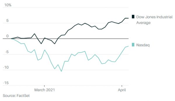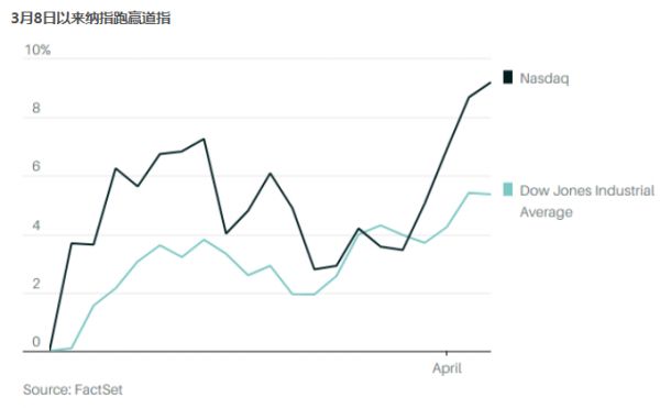 自3月8日开始反弹以来,纳指已上涨10%,相比之下,道琼斯工业平均指数同期涨幅为5%。