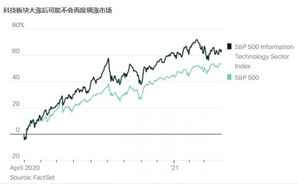 科技股跑赢行情已经结束是看待市场轮动的另一种方式。Leuthold Group分析师吉姆·保尔森(Jim Paulsen)的数据显示,按每一阶段过去12个月的回报情况衡量,科技板块之前曾连续16个月成为回报最高的一个板块,这也是自1928年以来,单个板块表现保持最优持续时间第七长的一次,也是历史上单个板块表现第九次保持最优超过15个月甚至更长时间。但现在,在截至3月31日的过去12个月里,科技股表现落后于材料股、能源股、非必须消费品股和工业股,说明科技股领涨的行情已经结束。
