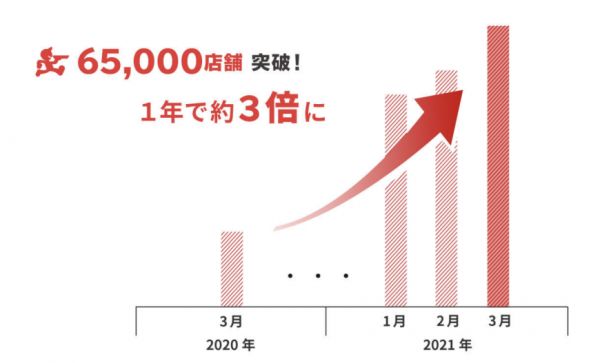 现阶段,日本最大的外卖平台是Uber Eats和出前馆。其中,出前馆是有着较长经营历史的日本本土平台,根据其官网上的最新信息,出前馆2021年3月25日的加盟店铺数量已突破65000,相比一年前翻了约三倍。