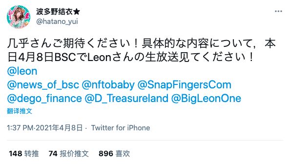 4月8日,日本AV女优波多野结衣发布推特表示,她将于当天在币安智能链BSC上发布自己的NFT写真集。