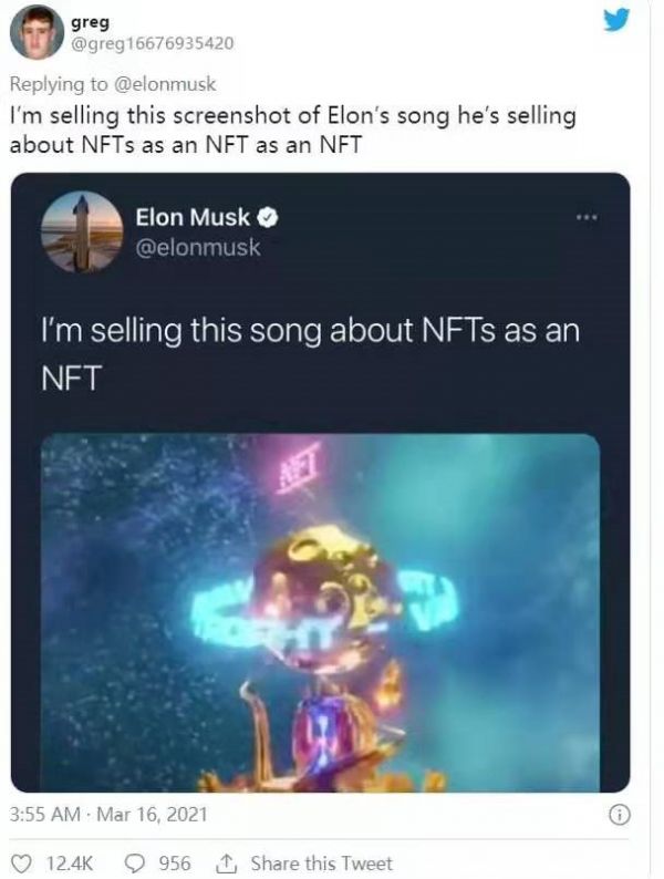 当马斯克售出他那首关于NFT的电音歌曲之后,一位叫greg的网友发现了“商机”,他立刻表明自己要把“马斯克发的关于卖掉歌曲的推特”的截图当作NFT售出。
