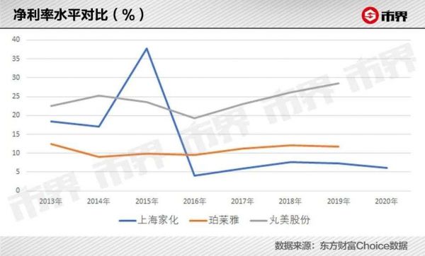 真正拉开差距的是净利率。2015年处置了之前参股的江天药业股权,导致上海家化净利润大增,而2016年开始,公司的净利润水平就一直低于同行。