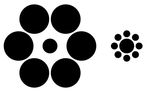 在艾宾浩斯-铁钦纳错觉中,两个位于中心的圆直径相同。在人类眼中,被更小的圆形环绕的那个圆,看上去更大。根据一项研究,这个错觉在狗狗眼中正好相反。THE SCIENTIST