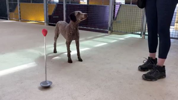 作为训练狗狗与视错觉互动的第一步,研究者需要让它们将“用鼻子触碰一个物体(这个实验中用的是棍子上的红色小球)”与“奖励”关联起来。SARAH BYOSIERE