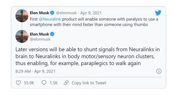 马斯克还在推特上公布了更多关于Neuralink的消息,称:“第一个Neuralink产品,可以使通过意念使用智能手机的瘫患者,速度比用手指的人更快。”