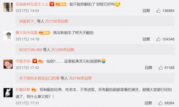《仙剑奇侠传1》翻拍消息下的评论几乎是清一色的反对之声。图片来源:新浪微博