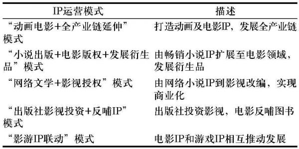 IP一直是文化产业领域的热词,当前比较典型的几种IP运营模式有“动画电影+全产业链延伸”模式、“小说出版+电影版权+发展衍生品”模式、“网络文学+影视授权”模式、“出版社影视投资+反哺IP”模式以及“影游联动”模式。[1]