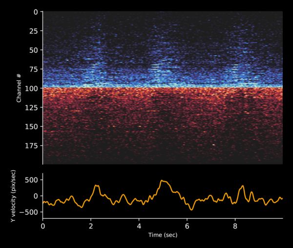 与此同时,猴子大脑里的芯片也在工作。芯片每一只芯片有1024个电极,能够捕捉大脑里的电信号,用电压的数值来表示。脑活动只要被数字化,就是计算机可以处理的信息了。