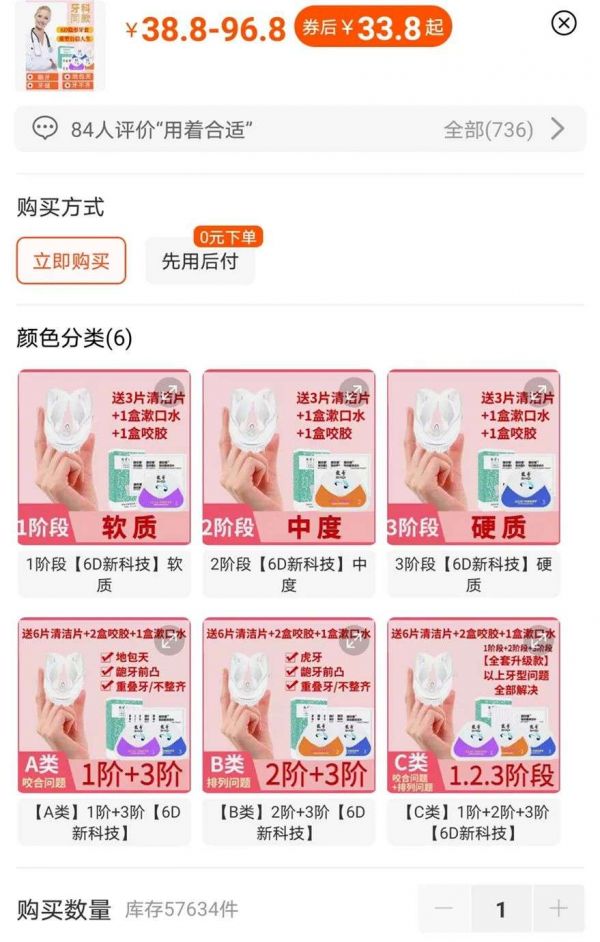 在电商平台上搜索隐形牙套,引入眼帘的是均价只要几十元,最贵也不过百元的产品。他们确确实实抓住了隐形牙套价格高昂的痛点,几家店铺的月销量都已经过万。买家秀中也出现很多没作用、用完牙齿酸涩的评价。