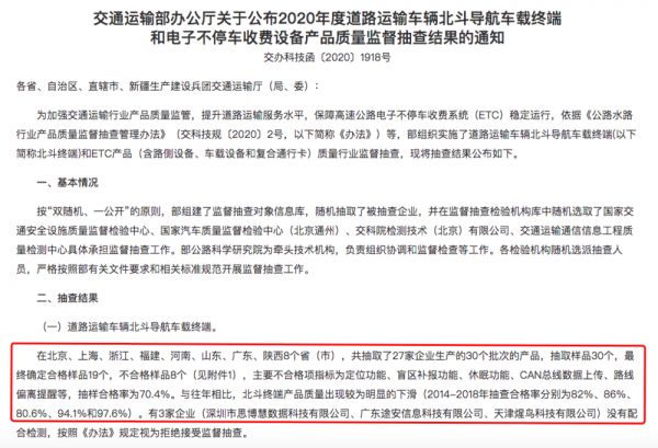 去年12月份,交通运输部公布了一组关于北斗导航车载终端的抽查数据,抽样合格率仅为70.4%,即市面上3台北斗导航设备几乎就有1台不合格。在抽查中,不合格样品主要在定位功能、盲区补报功能、休眠功能、CAN总线数据上传、路线偏离提醒等有缺陷。