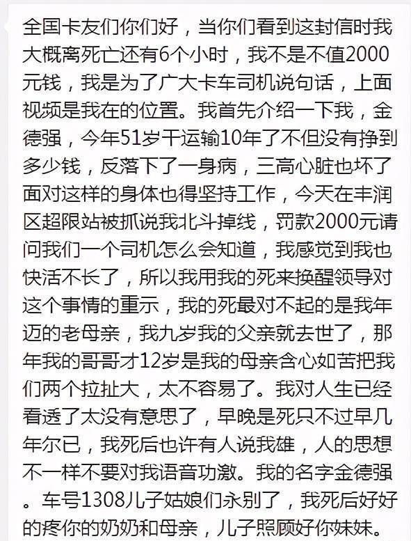 这几日卡车司机金德强因“北斗掉线”罚款2000元而服毒自杀的事情,令人唏嘘不已。他今年51岁,兢兢业业开了10年货车,每天能挣200-400元,支撑着六口之家,包括70多岁的母亲,3个孩子和种庄稼的妻子。人到中年,他也患上了高发病,如糖尿病、心脏病等。