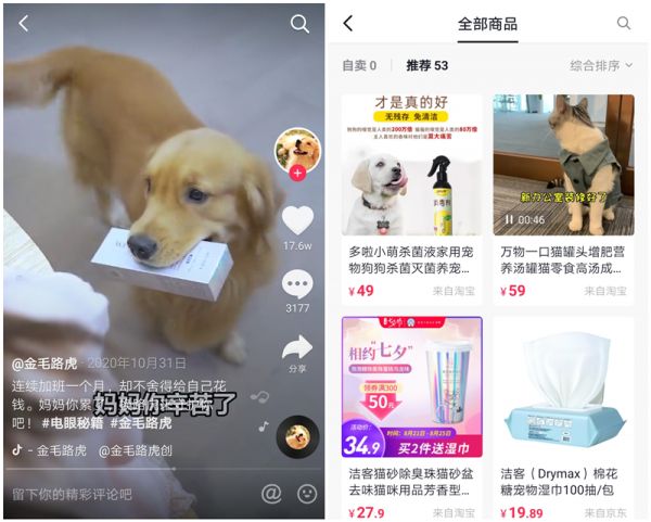 △左为金毛路虎与水密码合作 右为王泡芙抖音商品橱窗