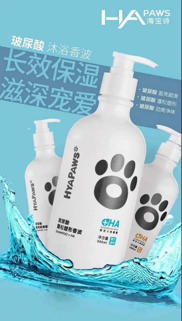 华熙生物在去年也推出了首个宠物品牌HYAPAWS海宝诗,该品牌也依托华熙生物在玻尿酸领域的优势,加入了玻尿酸专利成分cationHA™-Clear1和纳诺HA。据品牌官方介绍,纳诺HA是分子量小于10K道尔顿的玻尿酸微分子,更有利于皮毛吸收,以达到洗护双重功效。