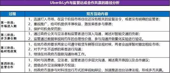 返回现象回顾这些年世界范围内Uber、Lyft和监管的博弈,其实也是“斗争”中求融合。并不是一个灰度监管和多方对抗的局面,如下图我们对美国网约车行业的研究,从这个路径分析中我们可以看出:第一阶段,在市场进入期,网约车行业中美同样面临着监管不确定的问题,Uber&Lyft主要立足点是支持司机和扩大用户;第二个阶段,双方开始进入磨合期,监管对于网约车行业的提议进行分析,互动沟通开始;第三阶段,矛盾激烈没有共识的区域,网约车一般撤出后继续沟通;第四阶段,实际上在公众对出行便利的需求推动下,各方开始合作进行监管合规研讨和立法。