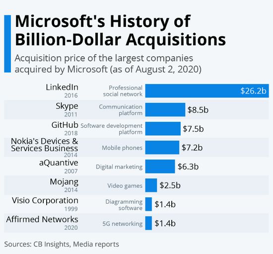 此前最大一笔收购案是在2016年,微软以262亿美元收购了专业社群网站领英(LinkedIn)。