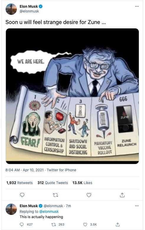 @腾讯科技【马斯克PS反疫苗漫画抨击盖茨,两个小时后删除被分享5000多次】特斯拉首席执行官埃隆·马斯克与微软联合创始人比尔·盖茨之间的恩怨由来已久,两人在很多问题上都存在分歧。最近,马斯克用一幅经过编辑的反新冠肺炎疫苗漫画对盖茨和微软便携媒体播放设备Zune进行了猛烈抨击。这副漫画最初是由保守派艺术家本·加里森(Ben Garrison)创作的,马斯克在发推时对其进行了重新编辑。大约两个小时后,马斯克删除了这条推文,但此前其已经被分享了5000多次。原版漫画的标题是“The Plannedemic”,它似乎表明盖茨正实施自己的阴谋计划,借助疫情来灌输恐惧,并最终让民众强制接种疫苗。