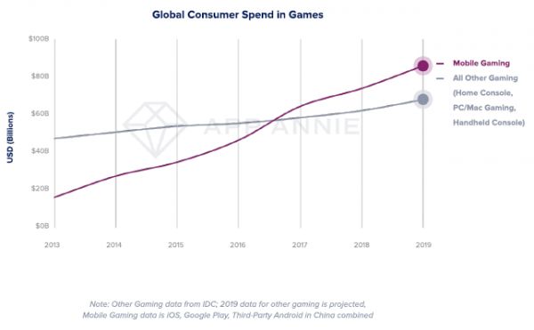 注:2019年,手机游戏(紫色线)增长势头明显超过电脑游戏、笔记本游戏和掌上游戏机游戏,达到千亿美元级别(来源:App Annie )