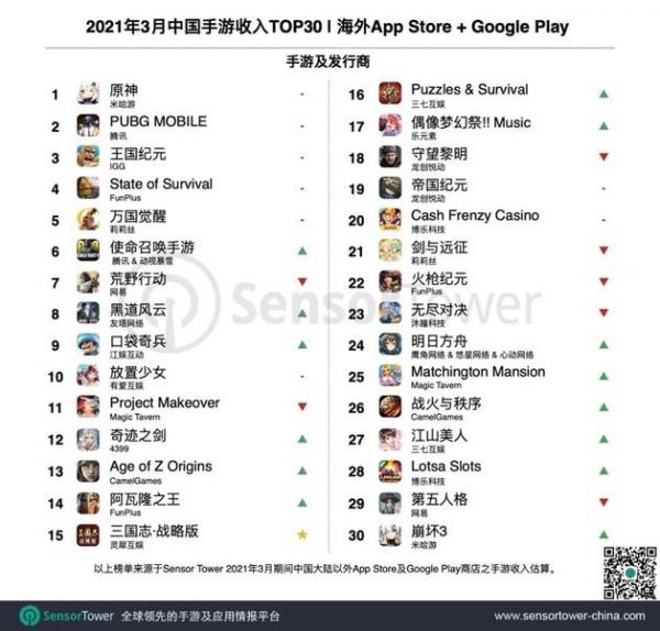 2021年2月成功出海的中国手游TOP30:《原神》五连冠