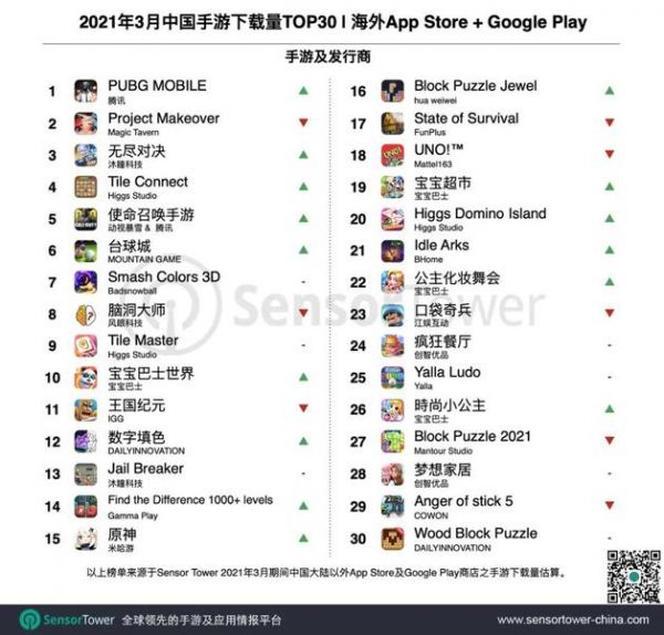 2021年2月成功出海的中国手游TOP30:《原神》五连冠,中国厂商拿下海外Puzzle手游9.2%的市场份额