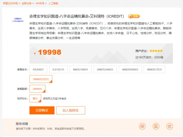 在国内主流的百度云、阿里云和腾讯云市场中,以“算命”“占卜”“解梦”等关键词进行搜索,三家网站均有数款基于云计算技术的产品。但其中,只有一家名为艾科瑞特(iCREDIT)的公司,标榜其产品——八字命运精批算命,采用了人工智能技术。