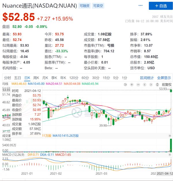 这个消息放出来后,昨天Nuance的股价涨近16%。微软股价股价上涨0.02%,从资本市场情绪来看,似乎更看好拥有150亿美元的市值的Nuance被收购。