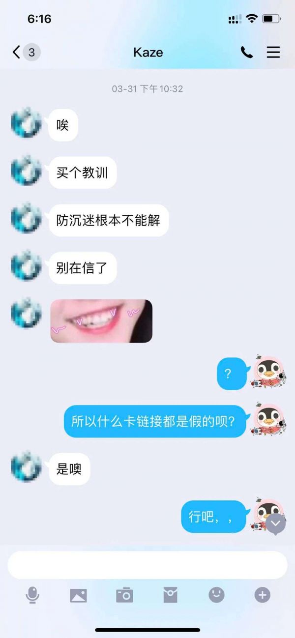 我向Kaze表示质疑,他向我解释说,这是因为“登录的时候草率了,没录到”,并且催促我自己登录账号看看。那时候已经是晚上10点以后了,根据健康系统的限制,未成年人在这个时间是不可能登录游戏的。我告诉他,我还是不能登录,而这时Kaze几乎是快乐地告诉我,“买个教训,防沉迷根本不能解,别再信了”。
