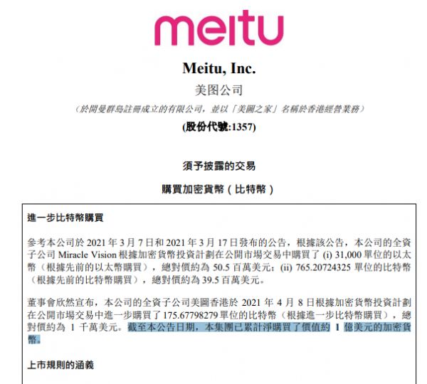 因美图秀秀软件闻名的美图公司(01357.HK)也是比特币的忠实粉丝。就在4月8日晚间,美图公司公告称,全资子公司美图香港进一步购买了175.67798279单位的比特币,总对价约为1000万美元。截至公告日期,集团已累计净购买了价值约1亿美元(约合6.55亿人民币)的加密货币。这已经今年3月以来,美图公司第三次投资加密货币。