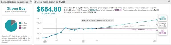总体来看,华尔街对英伟达的增长前景都较为乐观。在追踪该股的分析师中,有24位建议买入,4位建议持有,英伟达的共识评级为”强烈买入“,平均目标价为654.80美元。