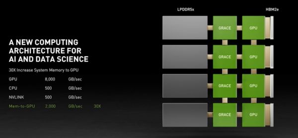 类似于 DMA 控制器在磁盘与内存之间搭建了一条快速通道一样,Grace 体系中 GPU 核心与 CPU 核心之间的通信不需要 CPU 的调度,也不需要占用数据总线的带宽,之前 CPU 必须将数据从其内存的区域复制到 GPU 使用的区域,而在 Grace 的加持下,CPU 只需要告诉GPU在内存的某位置有 30MB 的向量数据,然后就可以去做其它事了,GPU 则可以通过 Grace 复制通道迅速开始计算任务。
