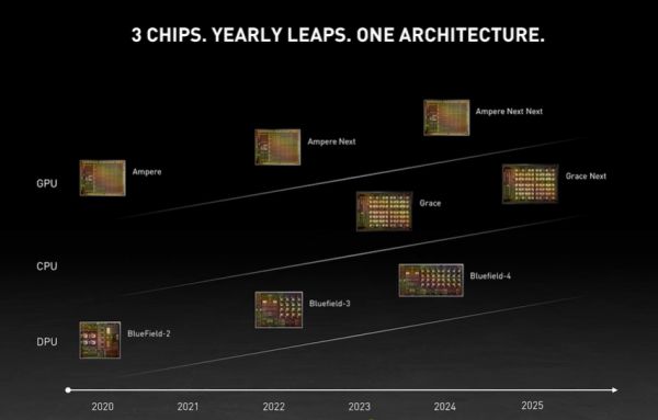 纵观整场发布会,英伟达真可谓是 AI 与智能驾驶齐飞,CPU 与 GPU 跨界。新时代的计算机需要新的芯片、新的系统架构、新的网络、新的软件和工具。英伟达全新的数据中心路线图已包括 CPU、GPU 和 DPU 三类芯片,英伟达也将被重新定义为三芯片公司。