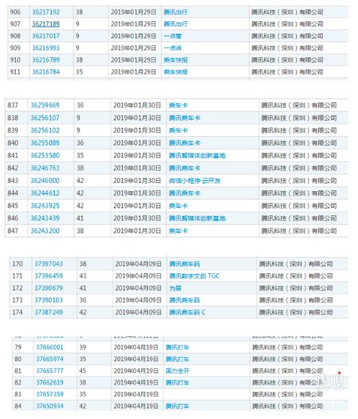 据中国商标网信息显示,自2019年1月29日以来,腾讯接连申请了“腾讯出行”、“腾讯乘车卡”、“乘车快报”、“腾讯乘车码”、“腾讯打车”等多个商标。