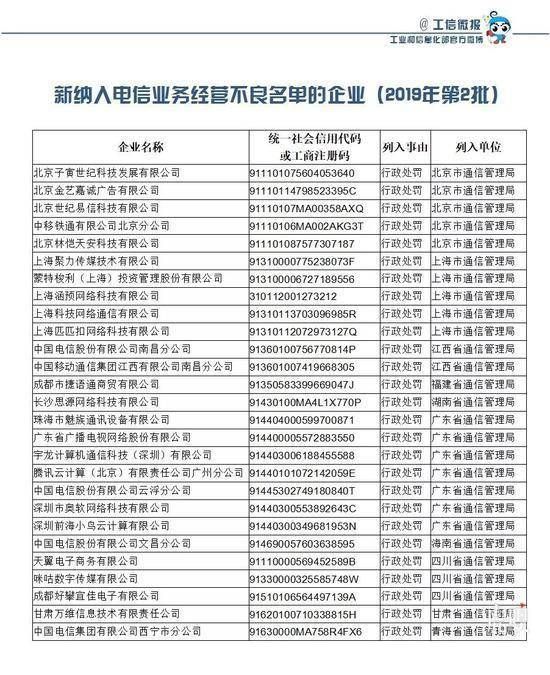 4月30日,据工信部网站,2019年一季度,依据《电信条例》《电信业务经营许可管理办法》等相关规定,电信管理机构对在经营电信业务、开展互联网信息服务、落实网络与信息安全责任等方面存在违规行为的27家企业,给予警告、罚款等行政处罚,并将其新纳入电信业务经营不良名单,现予以公布。其中,中国电信、移动、腾讯云等赫然在列。