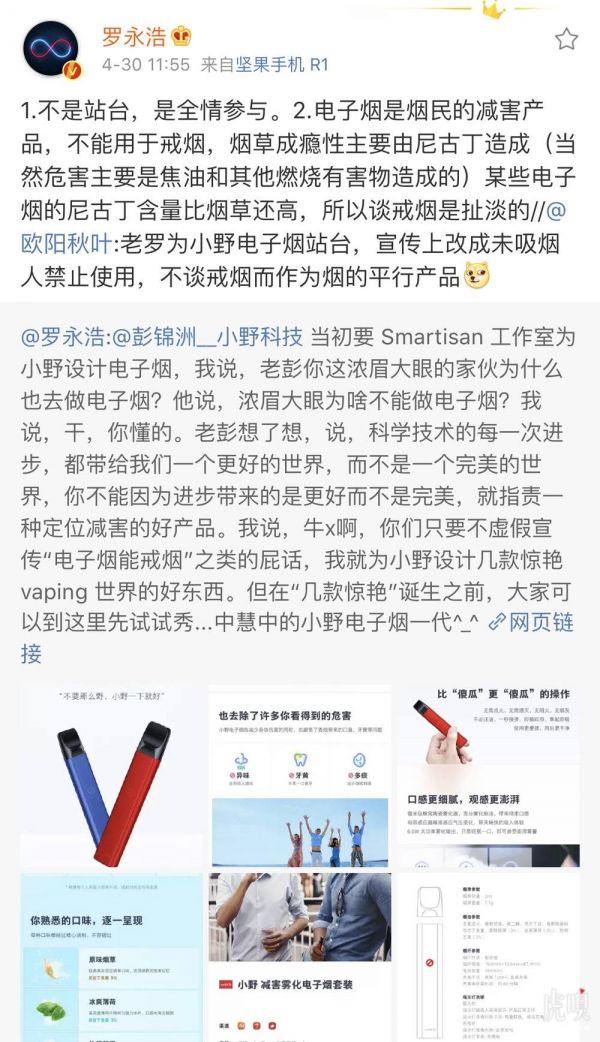 老罗在微博上表示,锤子科技前总裁彭锦洲做的小野电子烟项目他是全程参与其中的,而不是单纯的站台。他还在微博中不遗余力地宣传电子烟的好处,比如电子是烟民的减害产品,不能用于戒烟,烟草成瘾性主要由尼古丁造成(当然危害主要是焦油和其他燃烧有害物造成的)。老罗还指出,某些电子烟的尼古丁含量比烟草还高,所以谈戒烟是扯淡的。